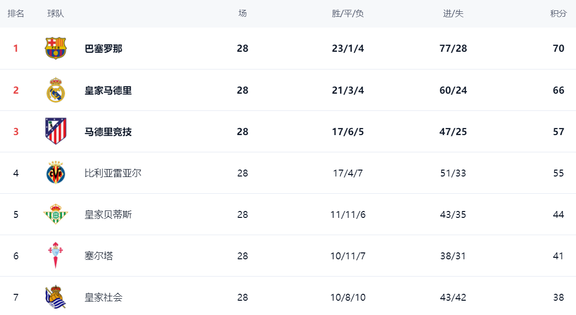 在积分榜上,巴萨继续领跑,拿到70分,战绩是23胜1平4负。巴萨继续压制皇马,领先4分。皇马以66分屈居第2名。马竞只拿到57分,排名第3。第4的是比利亚雷亚尔,拿到55分。皇家贝蒂斯只拿到一场平局,总积分是44分,排名第5,与身前的球队差距巨大。塞尔塔总积分41分,排第6。